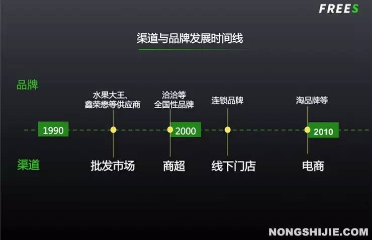 90 年代中期,各类蔬菜、水果大王的崛起得益于中国最大的蔬菜、水果批发市场「新发地」的出现;2000 年前后崛起的一批生鲜供应商巨头,则与沃尔玛、永辉超市等商超渠道的出现关系紧密。(本文仅讨论 C 端品牌,但该规律同样适用于 B 端品牌。)
