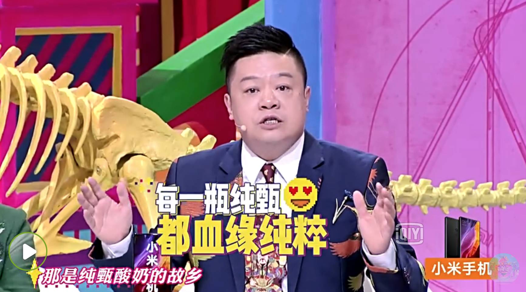 除了在节目内花式打广告以外,米未节目组还专门为纯甄定制拍摄了创意魔性小片。基于纯甄酸牛奶主打“无香精”的诉求点,米未节目组将故事创意场景设定为伴随90后观众长大的《还珠格格》,当熟悉的剧情被当红奇葩艺人组合肖骁、颜如晶反转演绎时,引发了全场爆笑,尤其是那句“酸奶选的好 皇上回宫早 酸奶没香精 皇上真开心”,着实让人忍禁不禁。