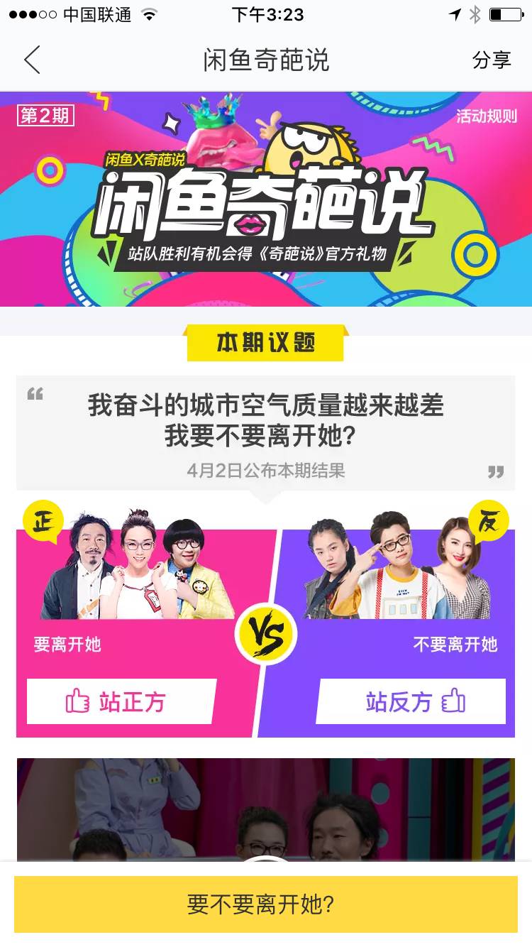 而闲鱼APP作为行业赞助则在《奇葩说》节目之外开辟了另一个辩论场。在外围,闲鱼与艺人及节目合作“大咖来了”及“闲鱼奇葩说”活动。节目中没尽兴的辩题网友继续在闲鱼站内讨论,艺人甚至会有特定的物品或技能在闲鱼上卖。闲鱼与奇葩说的合作可谓是真正的年轻化,整合营销尝试。