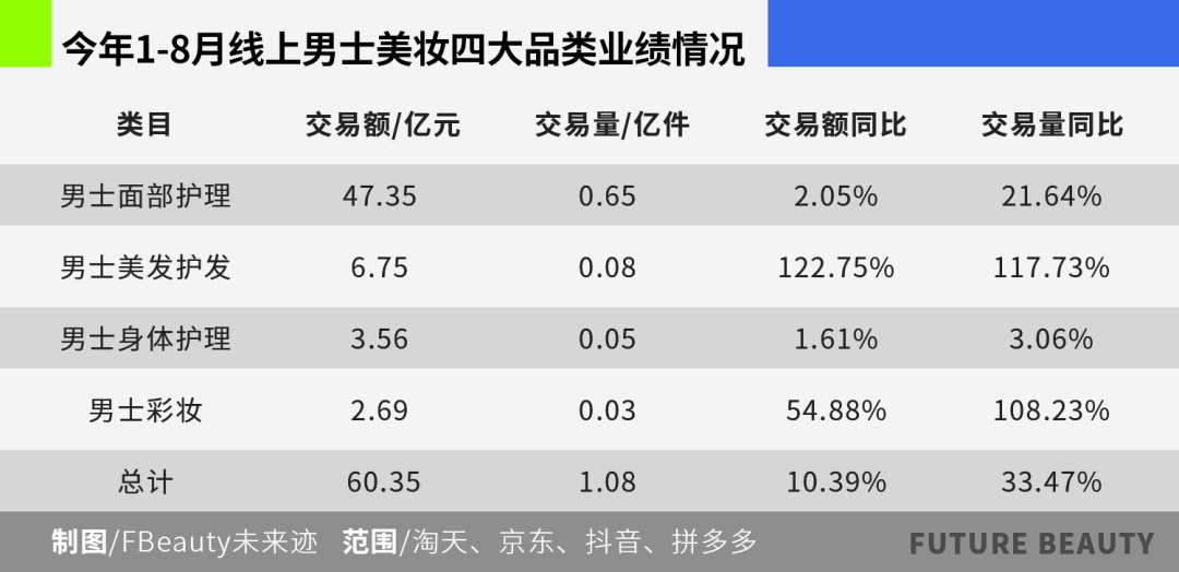 《FBeauty未来迹》整理淘天、京东、抖音、拼多多平台数据发现,男士面部护理、男士美发护发、男士身体护理、男士彩妆这四大男士美妆品类,共实现交易额60.35亿元、交易量1.08亿元,分别增长10.39%、33.47%,四大品类均迎双增长,可见男士美妆正在迎来全面增长。