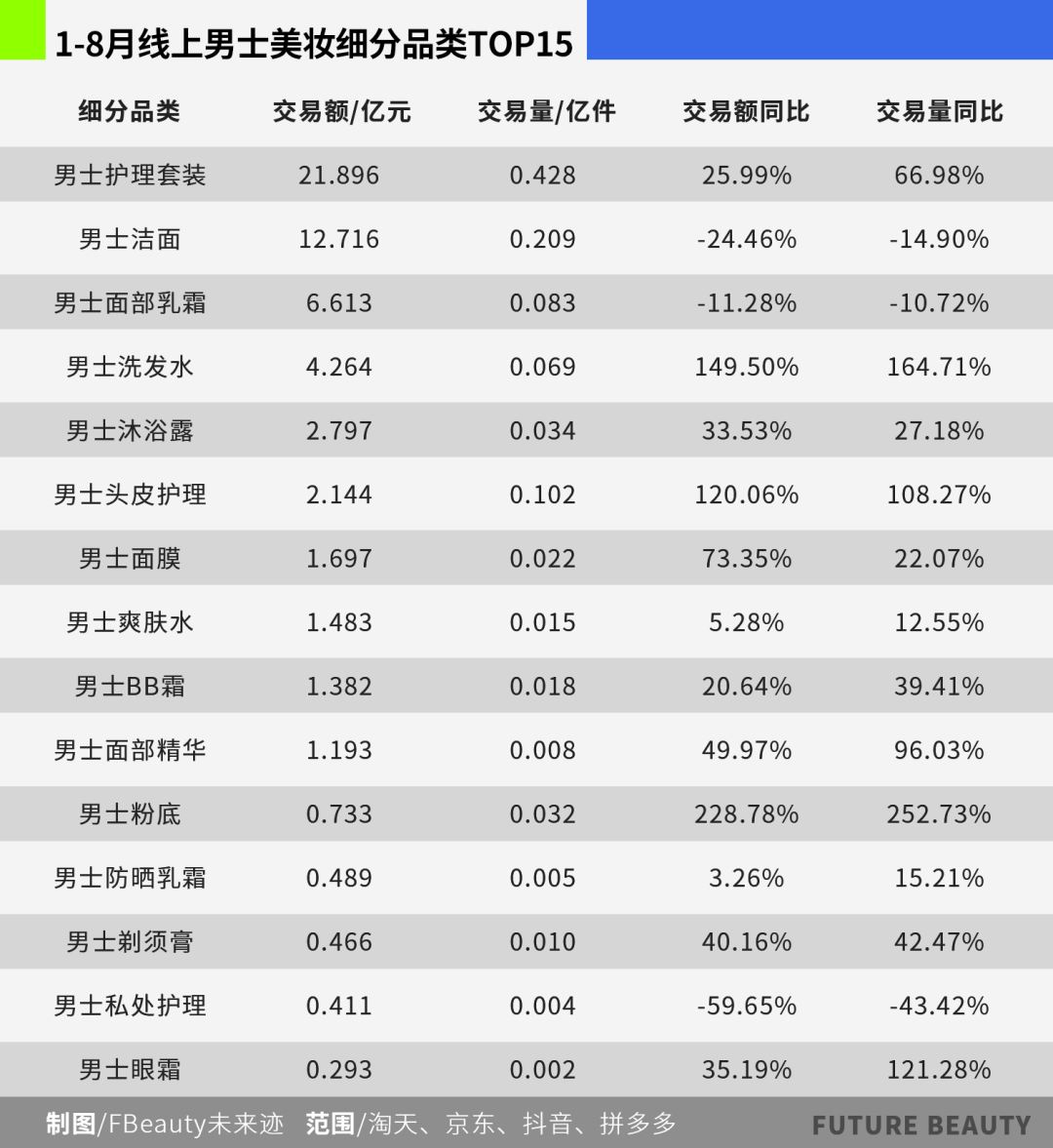 《FBeauty未来迹》进一步梳理男士美妆细分品类,发现,在今年1-8月线上男士美妆细分品类TOP15中,仅男士洁面、男士面部乳霜、男士私处护理这三个品类的交易额与交易量出现下滑,其余品类均实现正增长。