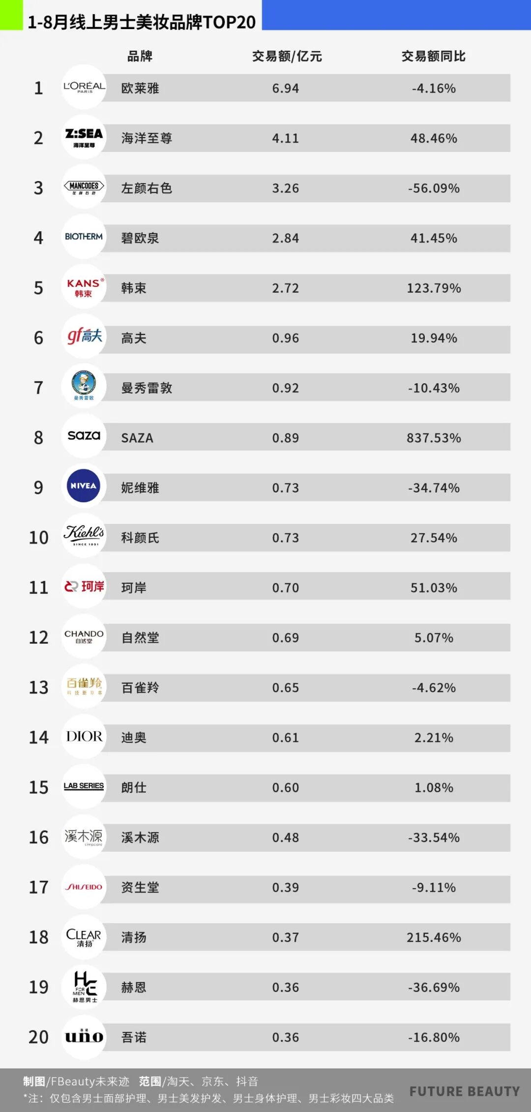 更值得行业关注的是,品牌格局正陷入“新旧撕裂”——TOP20品牌中9个同比下滑,曼秀雷敦、妮维雅等“传统玩家”增速承压,而韩束男士线、SAZA、清扬等却以“倍数增长”逆袭,展现出赛道旧玩法失效、新逻辑未固化的关键转折。