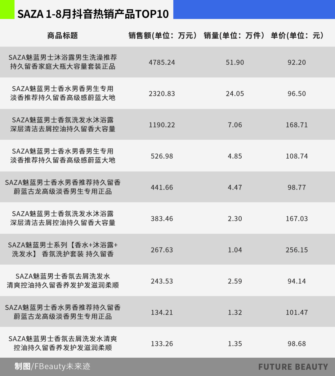 《FBeauty未来迹》发现,SAZA抖音1-8月抖音热销产品TOP10覆盖了沐浴露、香水、洗发水等,各类男士香氛是其产品最为突出的特点,印证“香氛+基础护理”的多元组合十分受市场青睐。