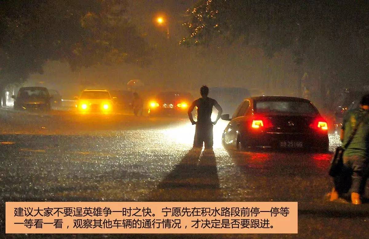 宁愿先在积水路段前停一停等一等看一看,因为总有比你莽撞的驾驶者会耐不住性子开车往水里冲,大家不妨先停在后面仔细观察,看看积水浸到轮圈的什么位置,看看有没有漫过排气管的可能,看看水深的变化情况。
