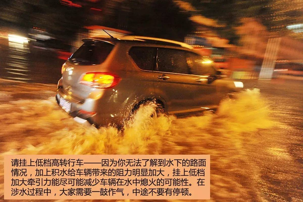 如果你已经决定要涉水了,那么请挂上低档高转行车——因为你无法了解到水下的路面情况,加上积水给车辆带来的阻力明显加大,挂上低档加大牵引力能尽可能减少车辆在水中熄火的可能性。在涉水过程中,大家需要一鼓作气,中途不要有停顿,同样是为了避免车子熄火后,积水从排气管倒灌入发动机。