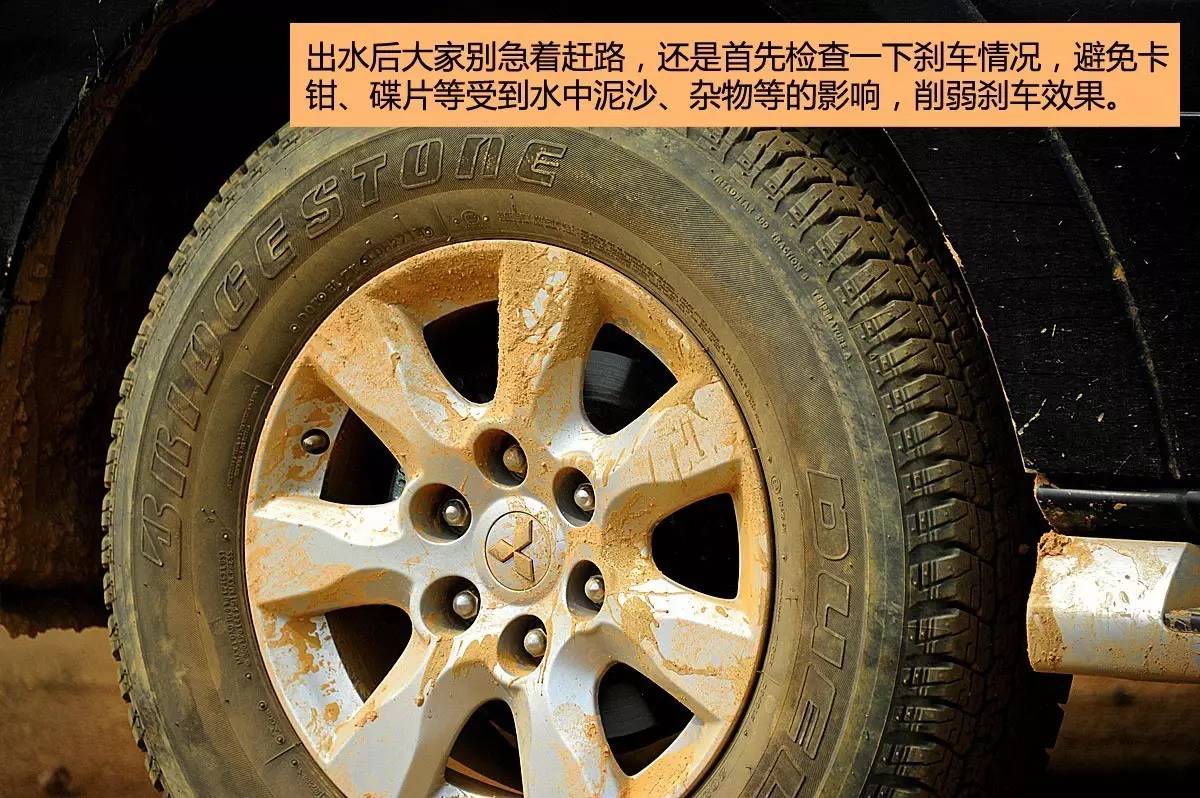 首先要恭喜你安全上岸,但是大家也别急着上路继续行程。积水、以及水中的泥沙等杂物,很有可能会影响刹车卡钳、刹车碟、刹车鼓和刹车蹄片等等的运作,在上岸之后,多踩几脚刹车并慢驶对刹车功能进行检查也是很有必要性的。