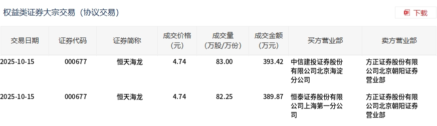 10月15日,恒天海龙大宗交易成交165.25万股,成交额783.29万元,占当日总成交额的7.08%,成交价4.74元,较市场收盘价5.3元折价10.57%。