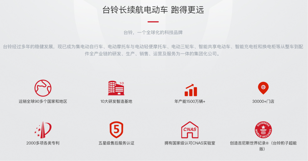 截至目前,台铃已成为集电动自行车、电动摩托车与电动轻便摩托车、电动三轮车、智能共享电动车、智能充电桩和换电柜等从整车到配件全产业链的研发、生产、销售、运营及服务为一体的集团化公司,并在全国拥有十大研发智造基地,年产能超过1500万台,同时布局3万多家门店,产品远销全球90多个国家和地区。