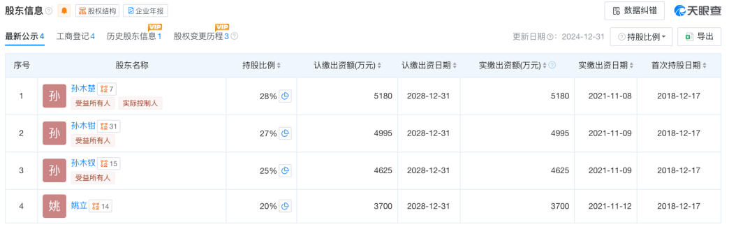 天眼查显示,截至目前,孙木楚持有台铃28%股权,其两位兄长持股比例分别为27%和25%,合伙人姚立持股20%。