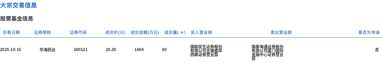 10月15日,华海药业大宗交易成交80万股,成交额1604万元,占当日总成交额的0.94%,成交价20.05元,较市场收盘价20.69元折价3.09%。