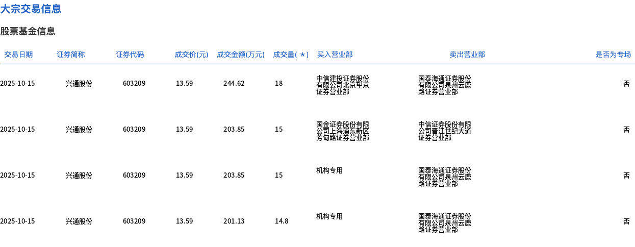 10月15日,兴通股份大宗交易成交117.8万股,成交额1600.9万元,占当日总成交额的34.07%,成交价13.59元,较市场收盘价14.75元折价7.86%。