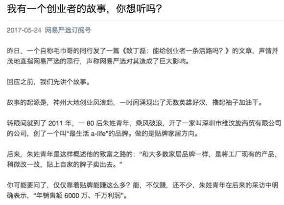 5月24日,一家名为“最生活”的毛巾创业公司以“毛巾哥朱志军”的署名给丁磊发了一封信,指责网易严选上架同款毛巾,风格描述雷同、并且侵权其G20官方专供身份。在文章最后,暗示网易严选“店大欺客”,不给创业者留活路。