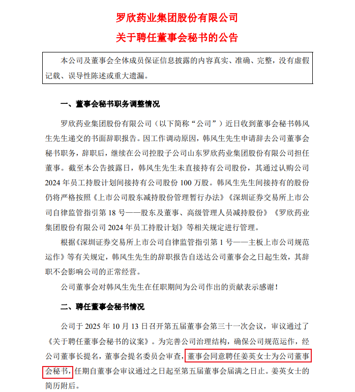 10月13日,罗欣药业(002793.SZ)公告称,因工作调动原因,韩风生辞去董事会秘书职务,董事会审议通过决定聘任姜英为公司董事会秘书。姜英在此之前曾在公募机构国泰基金担任基金经理,2024年离任,如今从基金经理转向上市公司,相当于换了新的“赛道”。
