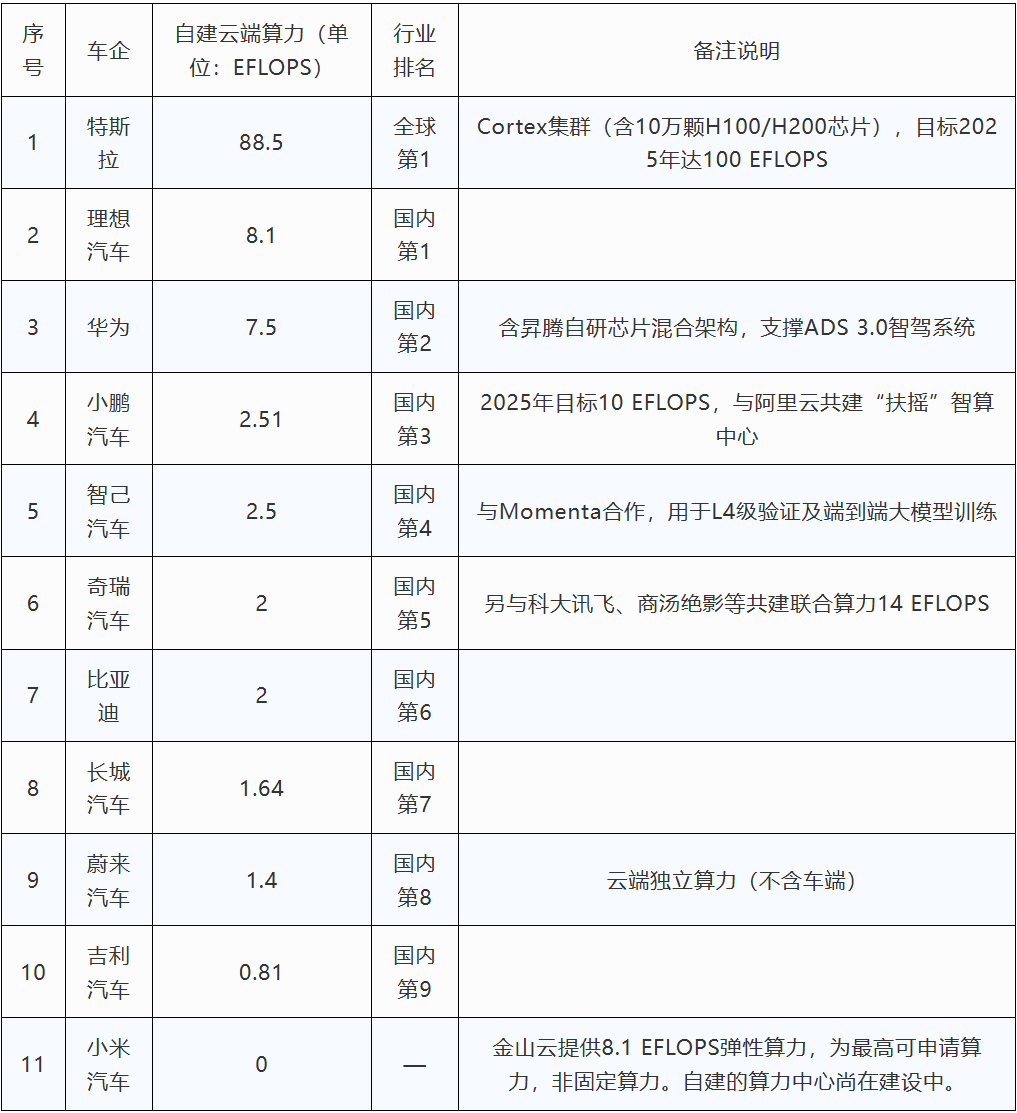 公开数据显示,截至今年8月,全球车企云算力排行中,除特斯拉以大约100 EFLOPS的云算力遥遥领先,其余理想(8.1EFLOPS)、小鹏(10EFLOPS)、小米(11.4EFLOPS)等头部智驾品牌的算力基本都要低一个数量级,至于再低两个数量级的哪吒等品牌,其云算力几乎不足以支撑VLA的高效训练。