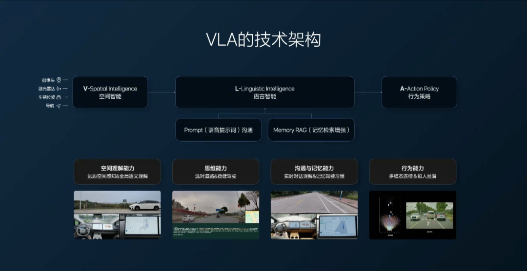 这也正是VLA技术理念的源头,同传统端到端模式的“数据映射”不同,VLA系统通过整合视觉、语言、行动三种模态,能够像老司机一样,将视觉感知到的信息转化为语言描述,再通过语言模型进行逻辑推理,最后输出具体的行动指令,甚至实现对几十秒长时序路况的预判能力。