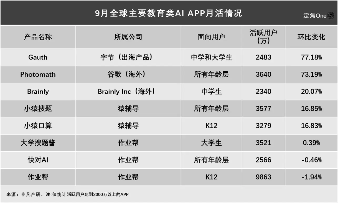 从榜单数据来看,9月月活用户超2000万的教育类AIAPP共8款,其中增速最快的是字节的“Gauth”。
