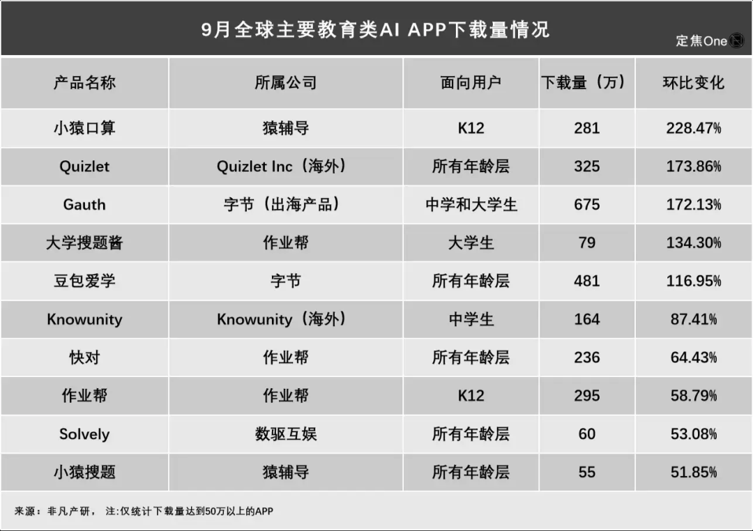 非凡产研提供的榜单显示,9月全球主要教育类AI APP下载量达到50万以上的产品有10款,其中猿辅导的“小猿口算”下载量环比增长超200%,作业帮的“大学搜题酱”、字节的出海产品“Gauth”和国内产品“豆包爱学”,以及海外教育公司Quizlet Inc推出的“Quizlet”都是超100%增长。