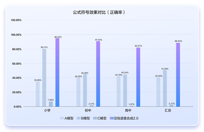 豆包语音合成模型2.0和豆包声音复刻模型2.0提升了学科教育场景下复杂公式符号的朗读表现,针对教育场景进行数据增广与模型优化,涵盖单位、函数、幂数、面积、化合物、复分解等上百种类,经过大量客户真实场景的复杂公式评测集测试验证,在小学至高中全学科(数学、英语、化学、物理、地理、生物)的复杂公式符号朗读任务中,平均准确率达 90% 左右。