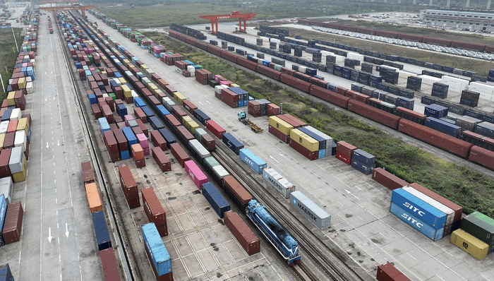 2025年10月14日,在南昌国际陆港,一列外贸班列正在发车。图片来源:CFP