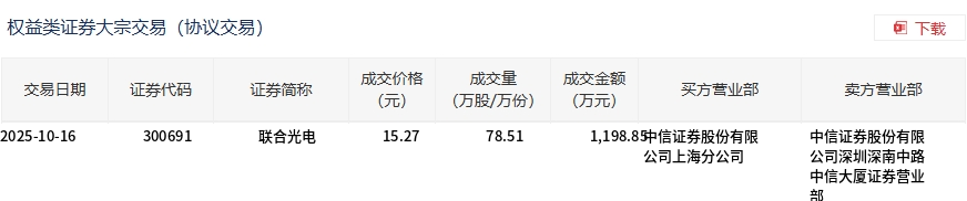 10月16日,联合光电大宗交易成交78.51万股,成交额1198.85万元,占当日总成交额的14.07%,成交价15.27元,较市场收盘价17.64元折价13.44%。