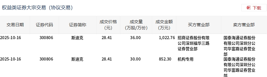 10月16日,斯迪克大宗交易成交66万股,成交额1875.06万元,占当日总成交额的2.36%,成交价28.41元,较市场收盘价28.84元折价1.49%。