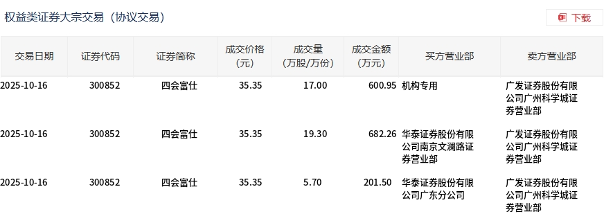 10月16日,四会富仕大宗交易成交42万股,成交额1484.71万元,占当日总成交额的6.13%,成交价35.35元,较市场收盘价39.28元折价10.01%。