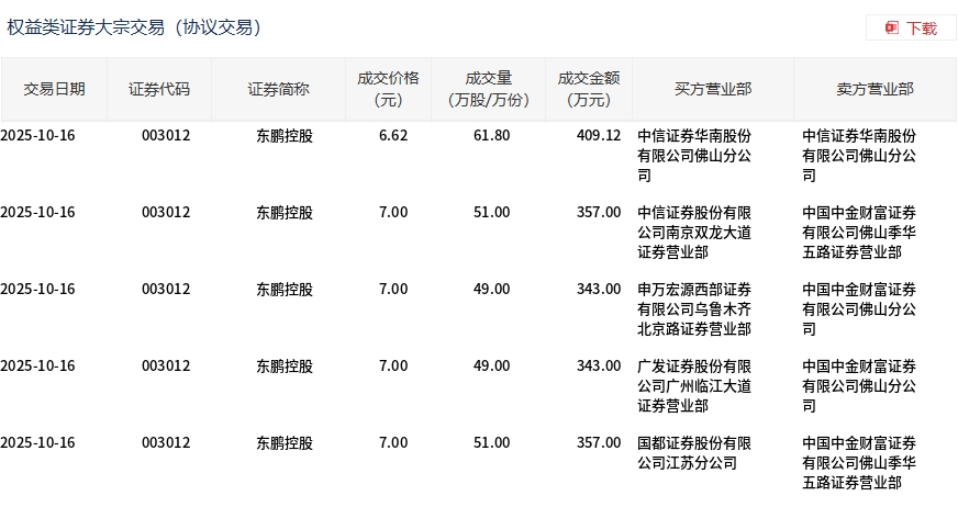 10月16日,东鹏控股大宗交易成交261.8万股,成交额1809.12万元,占当日总成交额的4.63%,成交均价6.91元,较市场收盘价8.1元折价14.69%,其中最高成交价7元,最低成交价6.62元。