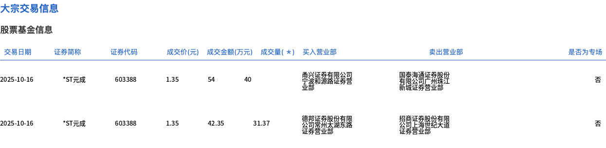 10月16日,*ST元成大宗交易成交71.37万股,成交额96.35万元,占当日总成交额的72.7%,成交价1.35元,较市场收盘价1.35元持平。