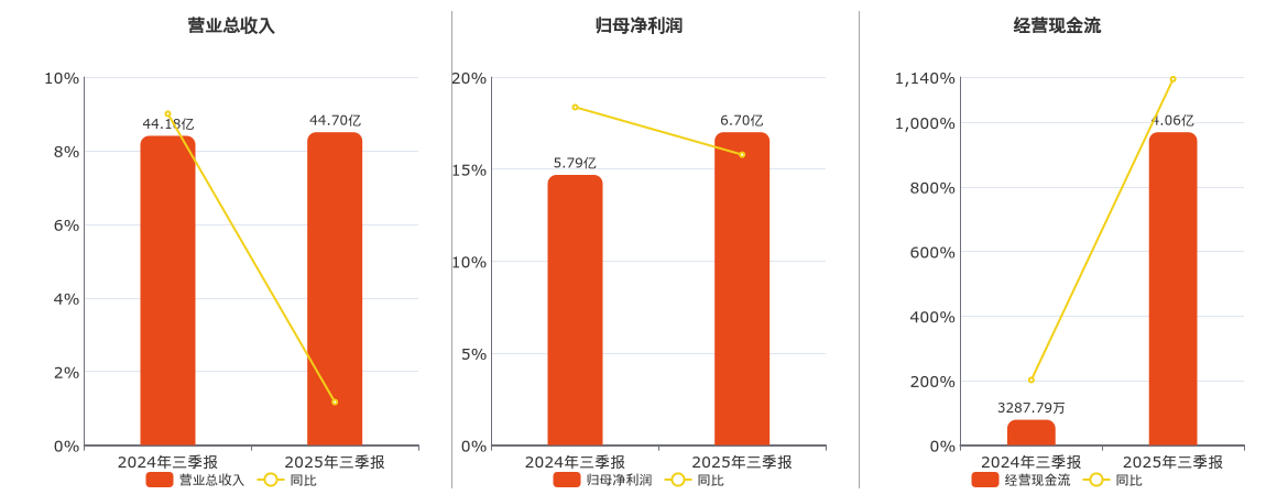 公司营业总收入为44.70亿元。归母净利润为6.70亿元。经营活动现金净流入为4.06亿元。