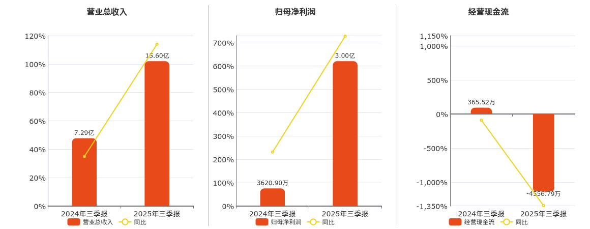 公司营业总收入为15.60亿元。归母净利润为3.00亿元。经营活动现金净流入为-4556.79万元,较去年同报告期经营活动现金净流入减少4922.31万元,同比较去年同期下降1346.67%。