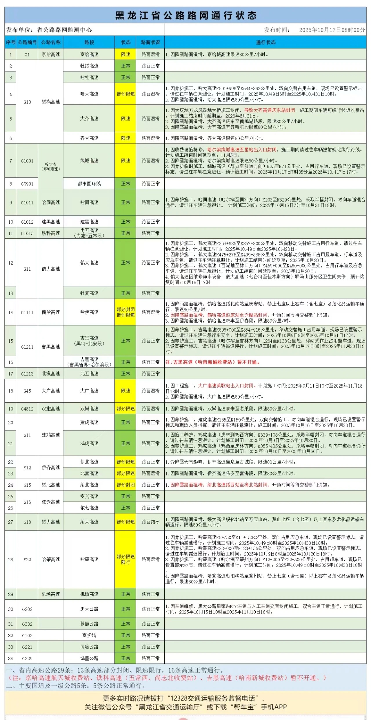 10月17日8时汇总路况信息:部分封闭限速限行的高速有(13条高速):1.双嫩高速(泰来至老莱站)、北富高速(依安至富海站)、齐甘高速、伊北高速(宝泉至古城)、京哈高速、哈尔滨绕城高速、哈大高速、鹤哈高速(双丰至伊春站)、大齐高速、大广高速,限速80公里/小时。2.鹤哈高速(赵家站至兴隆站)、绥北高速(绥西至海北站),封闭。3.鹤哈高速(绥化南站至庆安站)、绥大高速(绥化北至万宝山站)、哈肇高速(朝阳沟站至肇州站),禁止七座(含七座)以上客车及危化品运输车辆通行,限速80公里/小时。省内其它高速路况正常。