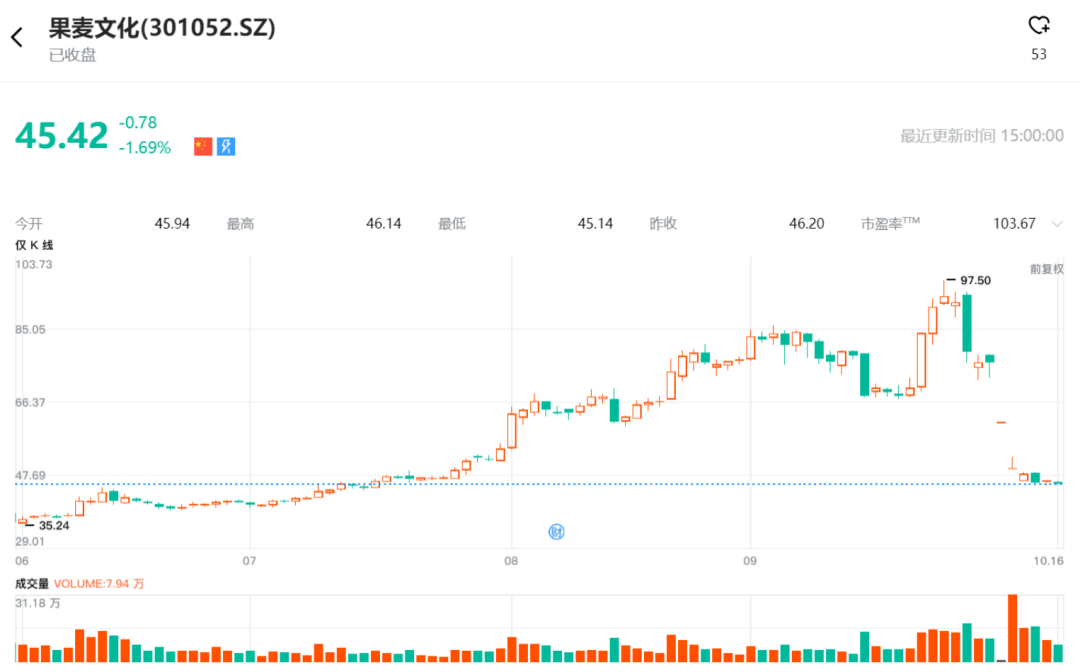 影片的市场遇冷直接反映在资本市场上。作为《三国的星空第一部》的主控方,果麦文化的股价自9月24日触及97.5元的高点后便急速下挫,一周内近乎腰斩。