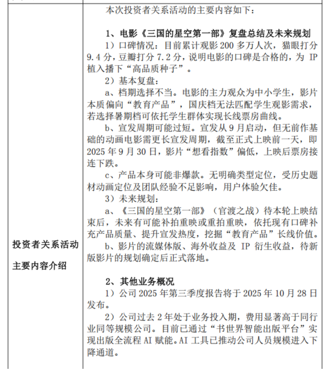 果麦文化在后续的机构调研复盘中将原因归结于三点:档期选择不当、宣发周期过短以及产品本身非爆款。公司认为,影片本质是面向中小学生的“教育产品”,国庆档并非其最佳上映时机,若放在暑期档或能依托长线放映获得更好收益。同时,果麦也透露了未来通过补拍重映、流媒体发行及IP衍生开发来挖掘长线价值的可能性。