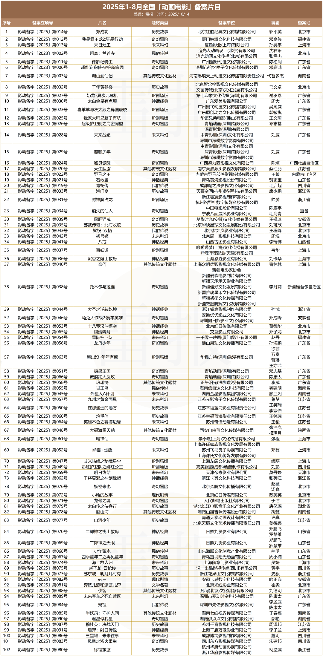 尽管《三国的星空》在商业与口碑上遭遇挫折,但这并未阻挡中国动画电影市场前进的步伐。相反,行业备案数量持续高企,显示出内容供给端的旺盛活力。据国家电影局公开信息,2025年1至8月备案的动画电影已达102部,逼近2024年全年的127部。