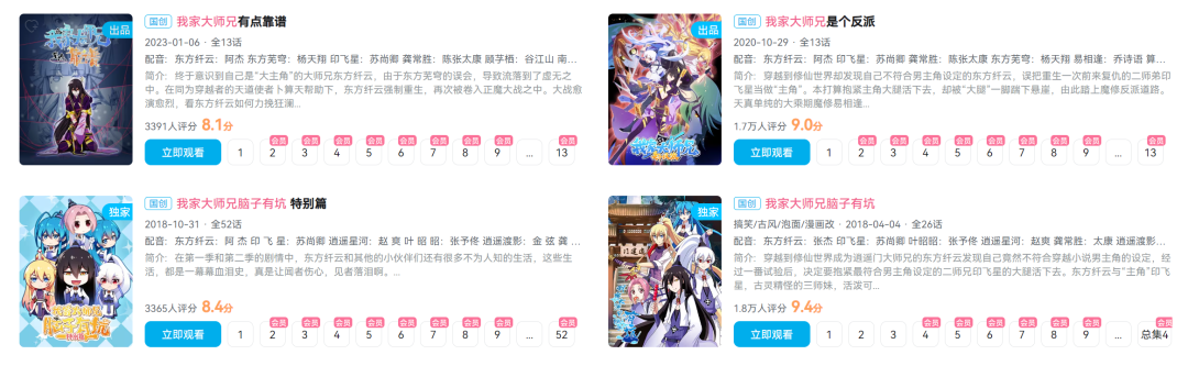 华谊兄弟备案的《我家大师兄脑子有坑》则改编自同名人气漫画,该IP的动画番剧已播出三季正片及一部特别篇,自播出以来,在B站已积累播放量5.85亿,追番人数超472万,具备良好的粉丝转化基础。