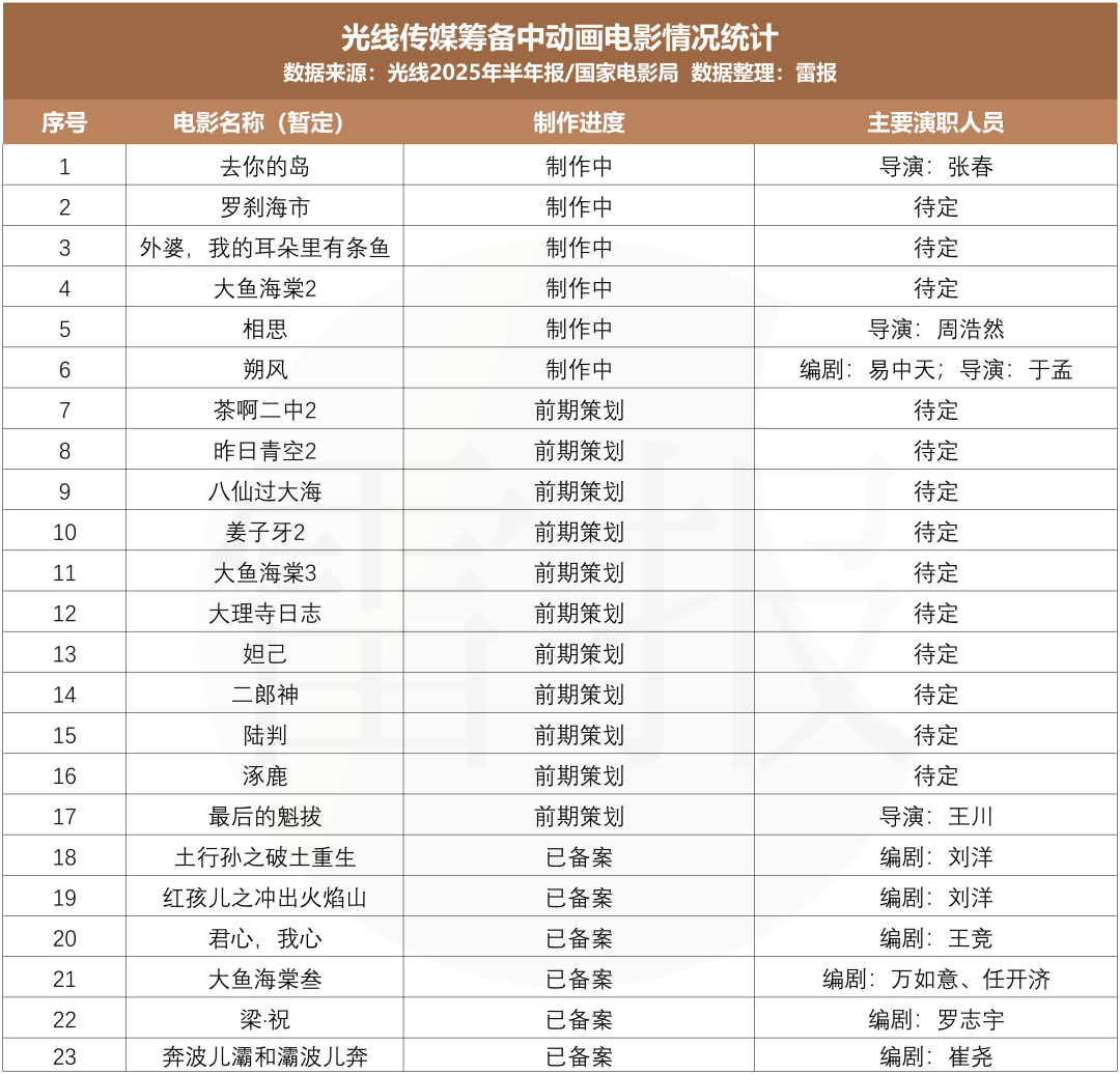 根据光线半年报,其动画电影项目储备极为丰富,《去你的岛》《罗刹海市》《大鱼海棠 2》《相思》《朔风》《外婆,我的耳朵里有条鱼》在制作中,《姜子牙 2》《茶啊二中 2》《昨日青空 2》《大鱼海棠 3》《大理寺日志》《最后的魁拔》《涿鹿》《妲己》《二郎神》《陆判》等等众多续作与新IP动画电影项目在推进中。同时光线透露,公司动画团队规模计划在明后年扩张至300人以上,以期为公司“神话宇宙”系列作品的持续生产提供稳定保障。