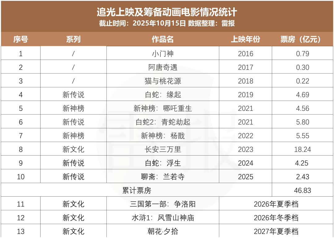 追光动画今年年初备案的《聊斋:兰若寺》目前已上映,取得了2.43亿票房,据公开信息,其后续还有《三国第一部:争洛阳》《水浒1:风雪山神庙》《朝花·夕拾》等重磅项目,继续深耕经典文学改编。