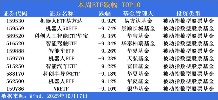 但是外围环境的不确定性加大以及资金面盈利兑现压力增加,近期人工智能相关的科技赛道波动加大。科创相关指数冲高回落为主,机构重仓的科技股显著调整。本周包括机器人、智能驾驶、科创半导体等相关ETF相关板块出现明显回调。
