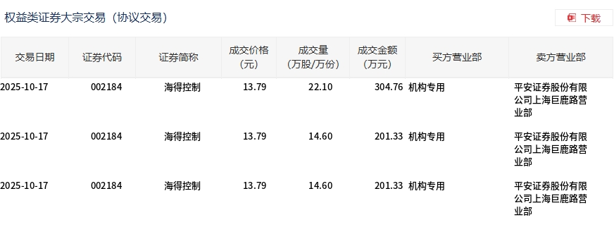 海得控制今日大宗交易折价成交51.3万股,成交额707.42万元