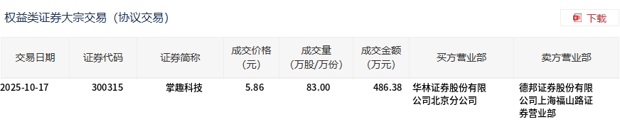 10月17日,掌趣科技大宗交易成交83万股,成交额486.38万元,占当日总成交额的1.75%,成交价5.86元,较市场收盘价5元溢价17.2%。