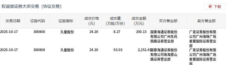 10月17日,久量股份大宗交易成交101.3万股,成交额2451.56万元,占当日总成交额的16.82%,成交价24.2元,较市场收盘价28.61元折价15.41%。