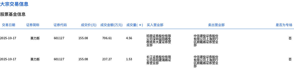 赛力斯今日大宗交易平价成交6.09万股,成交额943.88万元