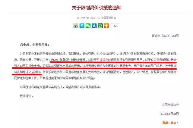 啥意思?这相当于NBA的球员工资奢侈税!你是亏损的俱乐部,引援花了多少钱,你就得给中国足协交多少钱。该政策主旨是规范各俱乐部高价引援。