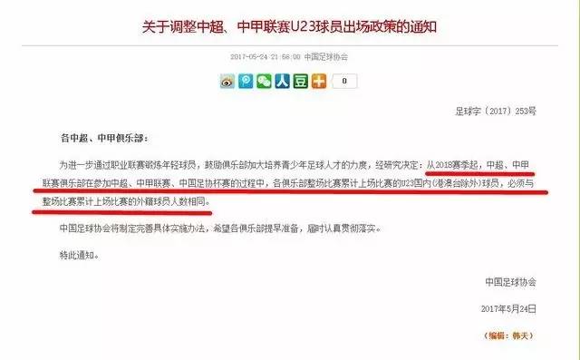 在更敏感、变数更大的U23新政中,通知中并没有提及,到底2018赛季中超中甲可以使用几名外援。是依然设置3人的上限?还是取消上限?即只要你敢上5名U23球员,就可以上5名外援?这是新政目前存在的疑点。