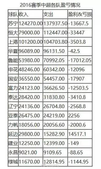 在2016年中超16支球队中,仅有延边和亚泰是盈利的,其余球队全部处在亏损状态,而且这两个球队盈利的空间也非常小。恒大则是亏损最高的俱乐部,虽然成绩好,但是恒大亏损了三个多亿。