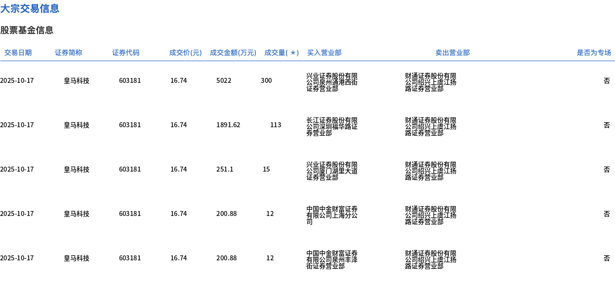 10月17日,皇马科技大宗交易成交500万股,成交额8370万元,占当日总成交额的15.89%,成交价16.74元,较市场收盘价17.43元折价3.96%。