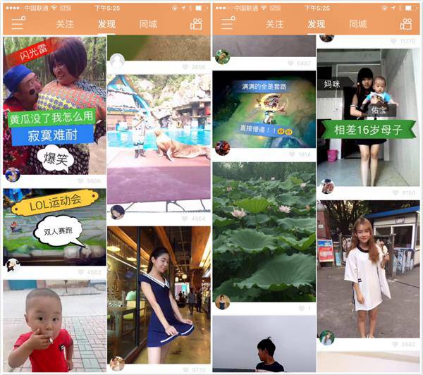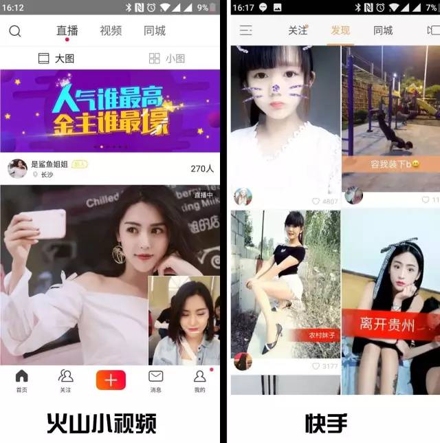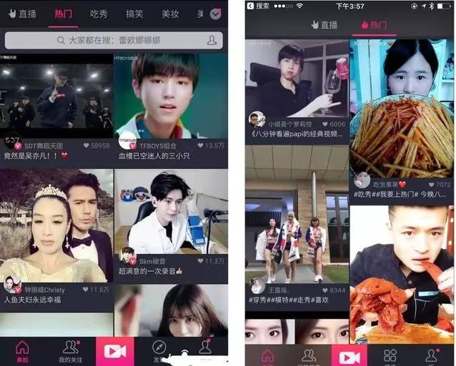 同样在和快手竞争的还有美图旗下的美拍。近两年随着秒拍、小咖秀等平台的崛起,拥有大量一二线城市用户的美拍,市场份额已经岌岌可危。很多用户发现,美拍的内容已经变得越来越像快手了。这表明美拍的目标用户正在从一二线城市向三四线城市下沉,而美拍也开始在迎合这类用户的需求。下图左边是之前的美拍,右边是现在的美拍: