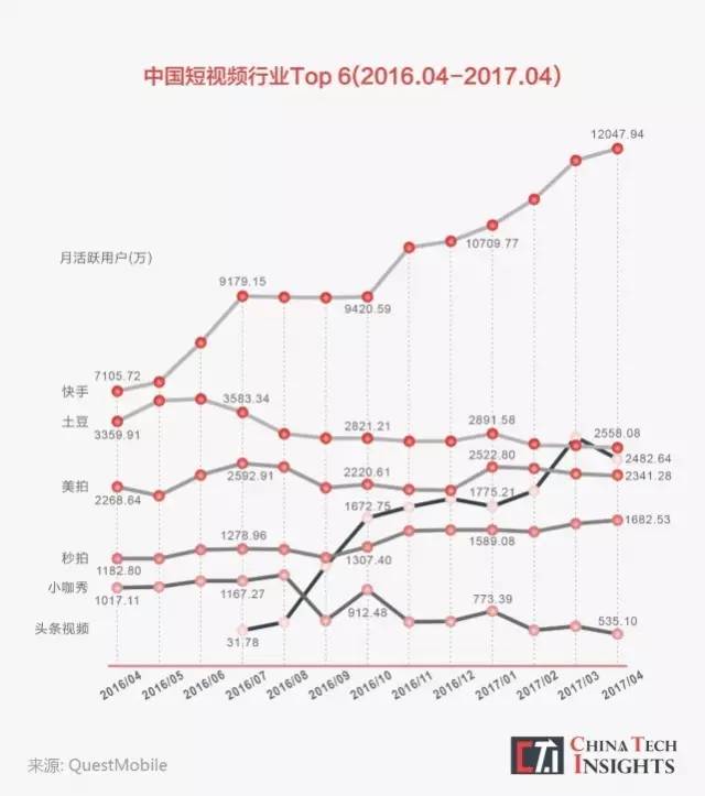 从快手的用户增长曲线来看,目前快手的用户量仍然处于第一的位置,并且在稳步增长中。当今天的美拍、秒拍、小咖秀等短视频平台还在依靠明星带动流量的时候,快手早已长为了一家拥有4亿用户、日活接近5000万的短视频平台。