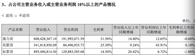 克明面业以生产“陈克明”牌挂面产品为主,财报数据显示,该公司在2016年实现营业总收入21.63亿元,比上年同期增长18.65%;归属于上市公司股东的净利润1.37亿元,比上年同期增长26.7%。其中,强力面、高筋面、如意面为三大主力产品,营业收入占总营收的90%以上。