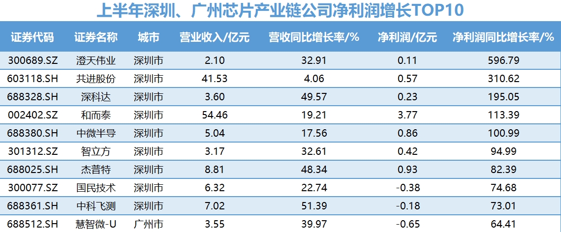 一个具象化表现是业绩明显增长。据界面新闻梳理,上半年注册地为广州和深圳的芯片公司中,不少呈现收入高增长:德明利增长88.8%至41.1亿元,云天励飞增长123.1%至6.5亿元,江波龙增长12.8%至102亿元,佰维存储增长13.7%至39.1亿元,兴森科技增长18.9%至34.3亿元。